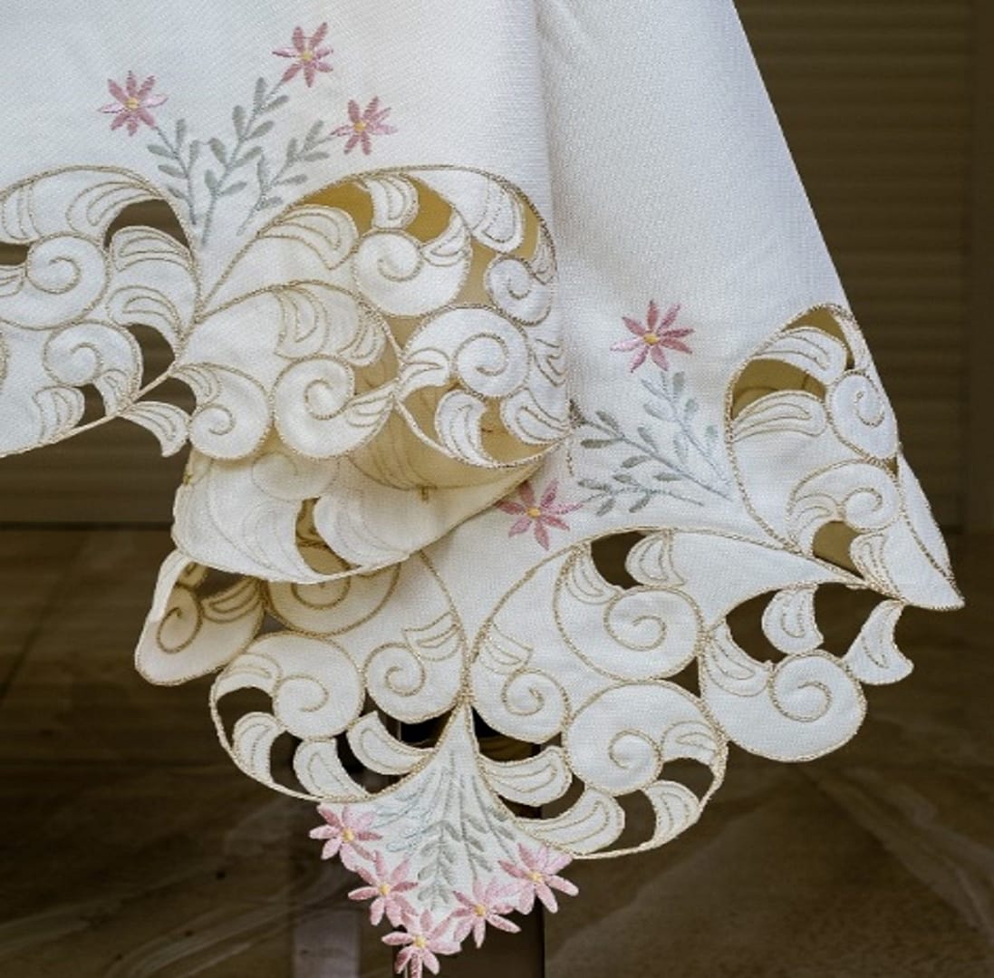 Elegant and refined poly table linen featuring delicate pink floral embroidery with latte cutwork. Ideal for those with a distinctive taste. Available in a variety of styles including runners, toppers, doilies, placemats, and full-size tablecloths. Easycare and washable.
